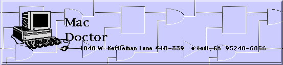 This page maintained by David Marson the Mac Doctor. We would appreciate any comments you may have. Please send your comments to mac_doc@mac.com. Copyright © 1995, 2001 Mac Doctor. All rights reserved.